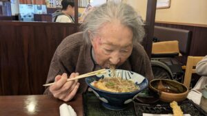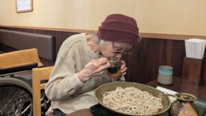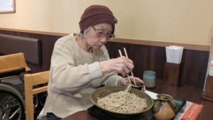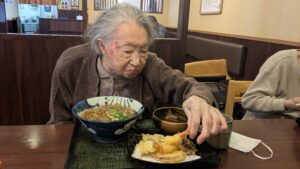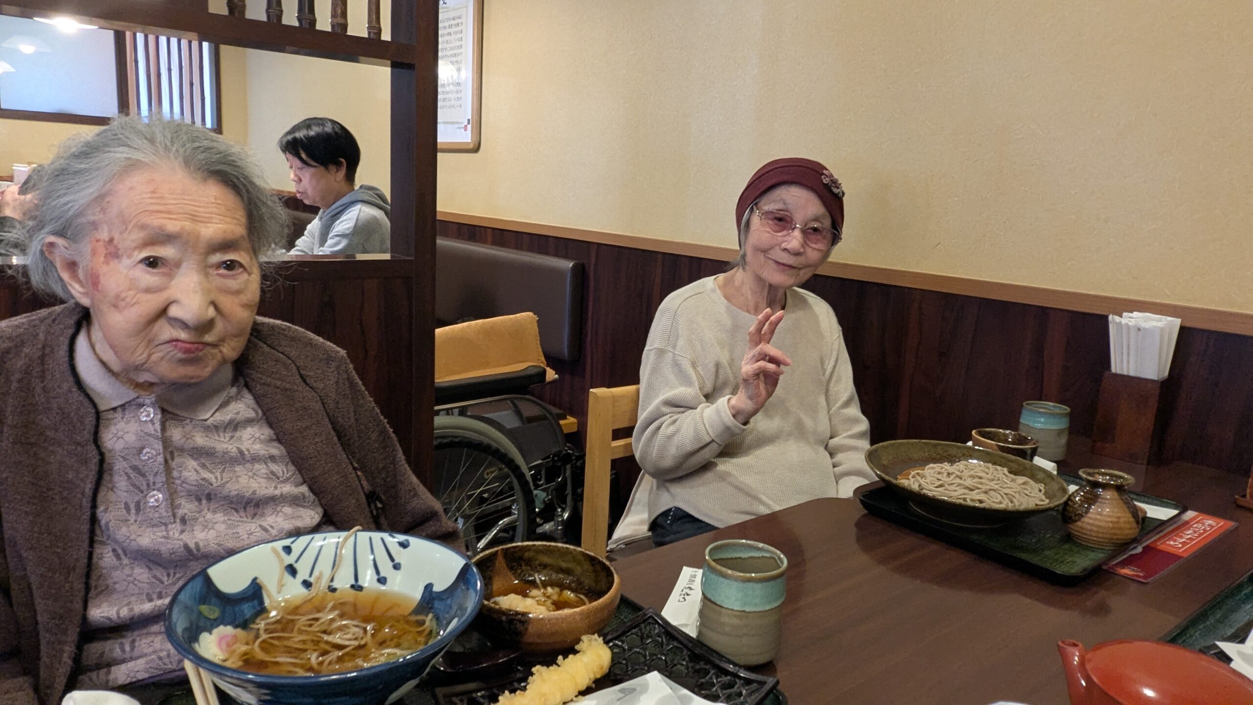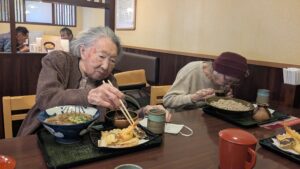 サクサクの天ぷらと温かいそばを召し上がり、満足されたご様子でお二人とも食事を囲みながら穏やかな時間を楽しまれていました