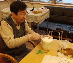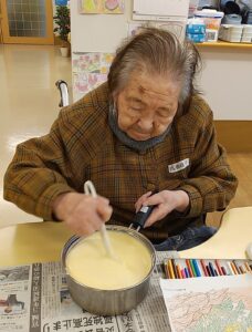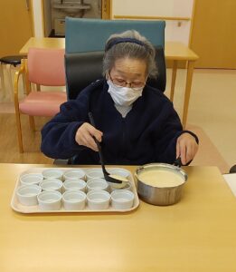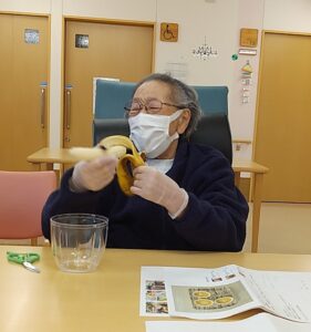 ある日ご利用者の皆と話をしている中で「女川のおんまえやスーパーに行ってバナナ買いたいなあ」とご利用者からの希望があり、「ではユニットで皆でバナナを使ったおやつ作りしませんか?」と聞いた所「いいなあ!」と話がトントン拍子に進み、バナナのクリームブリュレをユニットの皆で作ることにしました🍌🍌🍌