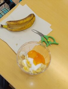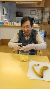 おやつ作りは、バナナを剥く係と材料を混ぜる係と器に材料を入れる係に分かれご利用者の方と一緒に調理開始です🧑🍳👨🍳👨🏻🍳👩🏻🍳🧑🏼🍳