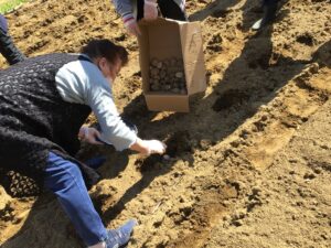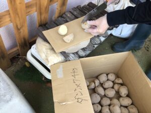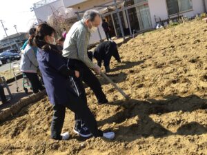 しおんガーデンに桜の花が🌸咲き始めた今日4月6日天気に恵まれデイサービスをご利用のみなさまと一緒にじゃがいもの種まきを致しました🥔