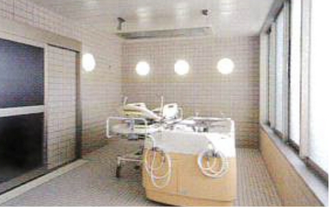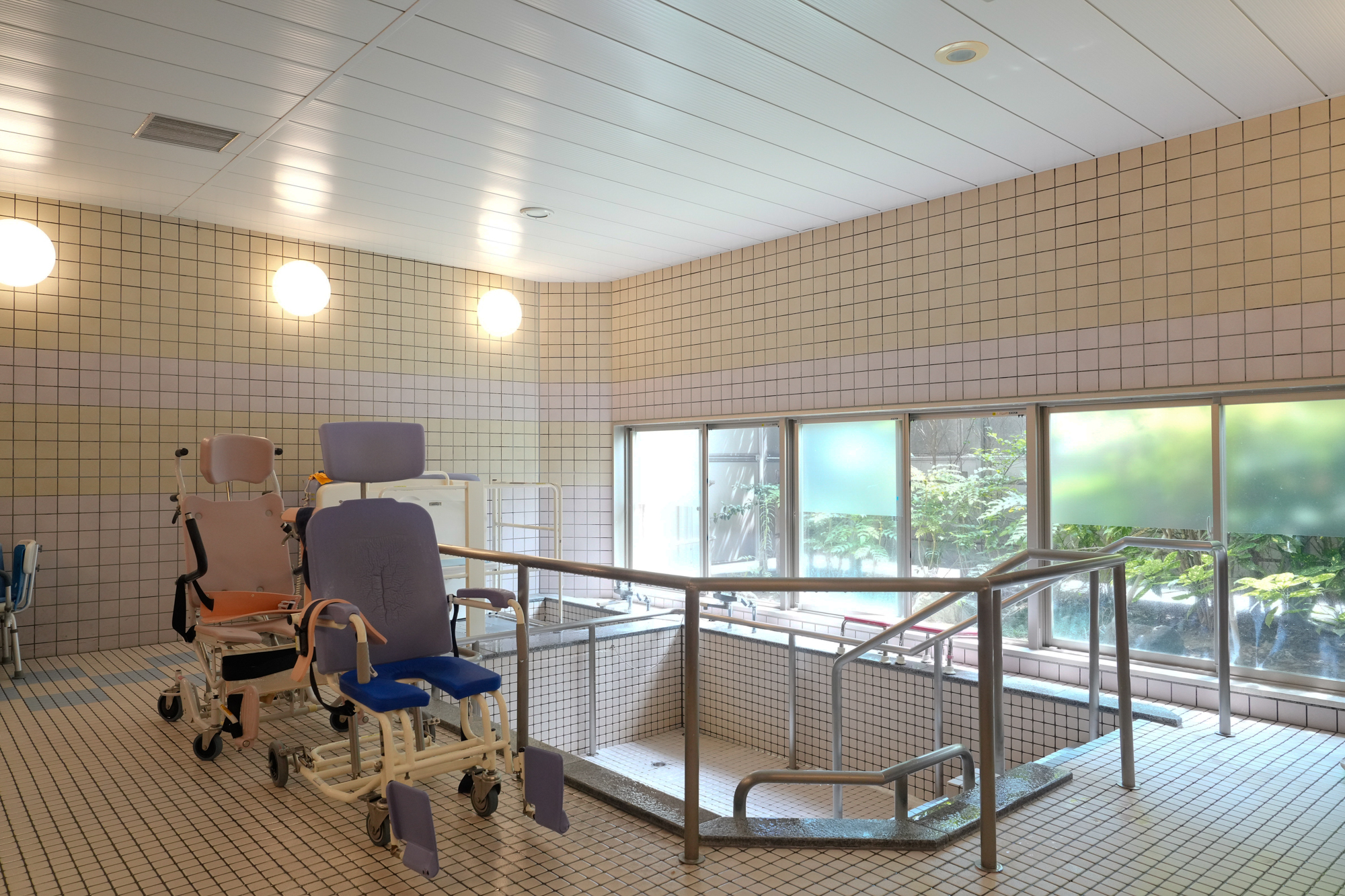ストレッチャーや車椅子での入浴に対応した浴室です。専用の入浴装置により、無理なく、快適に入浴していただけます。脱衣室にはリハビリの視点を取り入れた介助バーが設置されています。