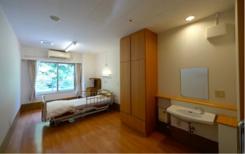 転倒、転落に配慮したクッションフロアを使用。立ち上がり動作を支えるスイングバーや低床電動ベッド、自動吐水の電気湿水器、洗面台、クローゼット、床頭台、ナースコールなどで入所生活をサポートします。